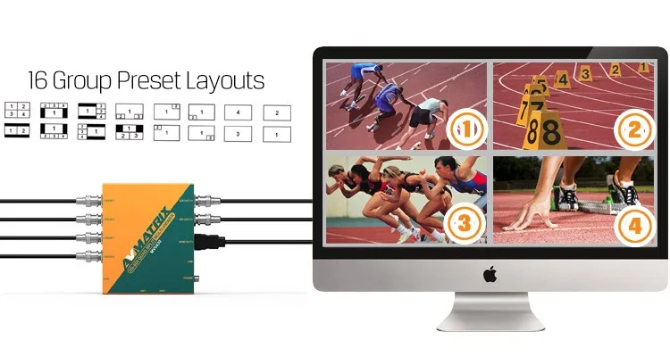 This 4 channel SDI scaling multiviewer scaler include 16 group preset layouts like frequently-used modes like quad split, full screen, triple windows, PiP and PoP mode etc for customers' choice.