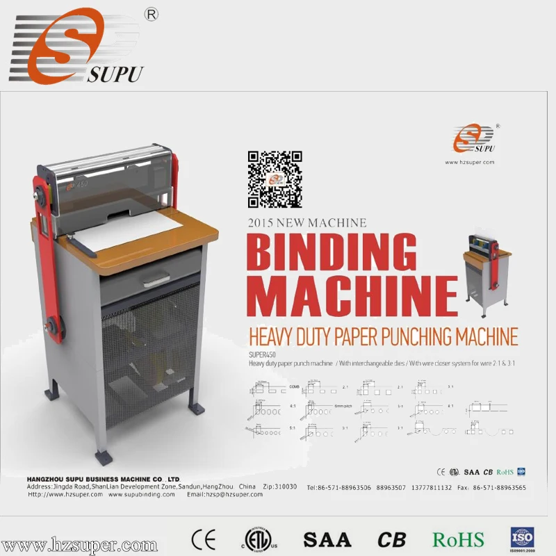 Hangzhou supu business machine Co.,Ltd is a professional manufacturer & exporter of binding machine &creasing machine in China. Our products include: comb binding machine,wire binding machine ,spiral binding machine ,commercial punch machine,perfect binder ,heavy duty punch machine ,Electric coil inserter,wire closer and creasing machine .we have got a subsequent development by hard work following the principle of eternity innovation ,excellent quality and satisfied service with all operations conducted according to CE,ETL,SAA,CB,RoHS and ISO9001.