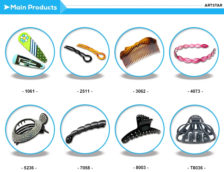 | Our Feature 1.Colors are optional, up to 300 colors; or customized 2.Plastic PC material, not easily breakable 3.Plastic hair accessories manufacture experiences with 30 years 4.Fashion, Practicality 5.Applicable to party, daily, wedding 6.OEM, ODM are acceptable Our Advantage