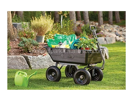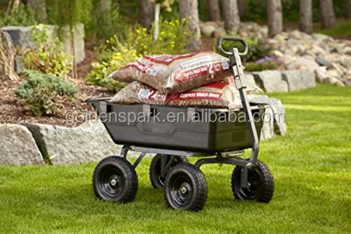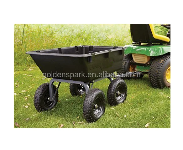 Designed with a 40-inch by 25-inch rust resistant poly bed, steel frame and black finish; Patented 2-in-1 handle allows cart to be towed behind a lawn tractor or ATV or pulled easily by hand
