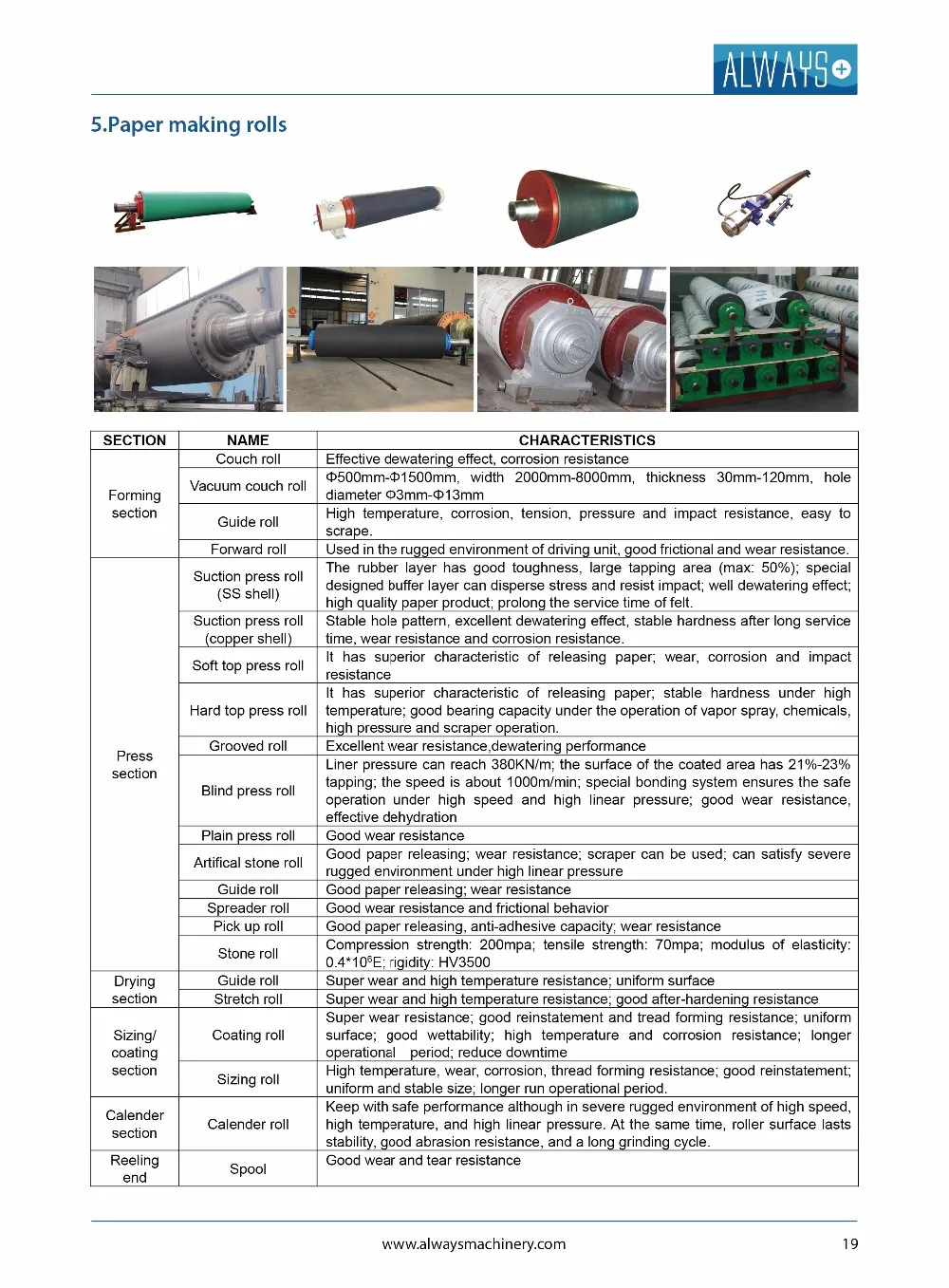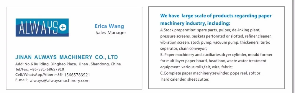 Jinan Always Machinery Co., Ltd. is mainly engaged in exporting paper machine and providing high quality products and service for foreign customers. Our products mainly exported to Southeast Asia, Africa, Latin America and other more than 10 countries and areas. We are the key manufacturer specializing in papermaking machinery equipments. Acting as a local representative of manufacture for the last few years, it primarily deals paper machinery spare parts in China. Meantime we have established a good reputation and dependability in the market through our committed services to all concerned. We have large scale of products regarding paper machinery industry, including: A.Stock preparation: spare parts, pulper, de-inking plant, pressure screens, baskets perforated or slotted, refiner, cleaner, vibration screen, stock pump, vacuum pump, thickeners, turbo separator, chain conveyor; B. Paper machinery and auxiliaries:dryer cylinder, mould former for multilayer paper board, head box, waste water treatment equipment, various rolls, felt, wire, fabric; C.Complete paper machinery:rewinder, pope reel, soft or hard calender, sheet cutter.