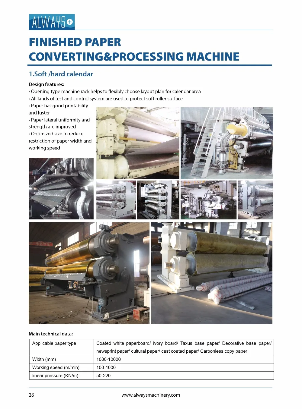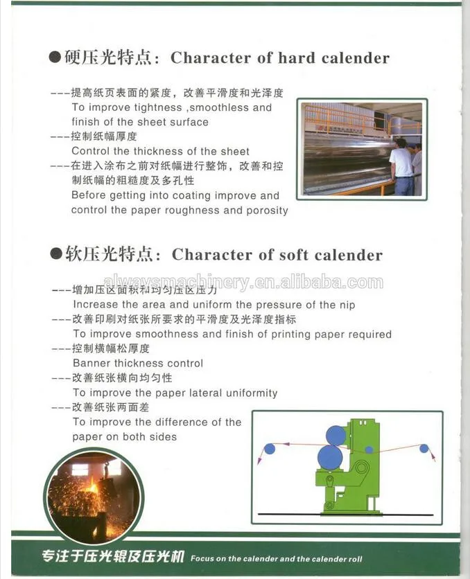 The calender machine is equipped in paper machine with the same net paper width. It is used to calender newspaper, halftone paper and other cultural paper and industrial paper improving paper smoothness, glossiness and tightness so as to make paper thickness uniform and to improve paper appearance quality.