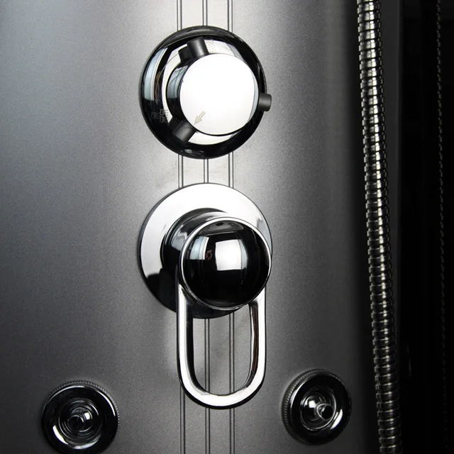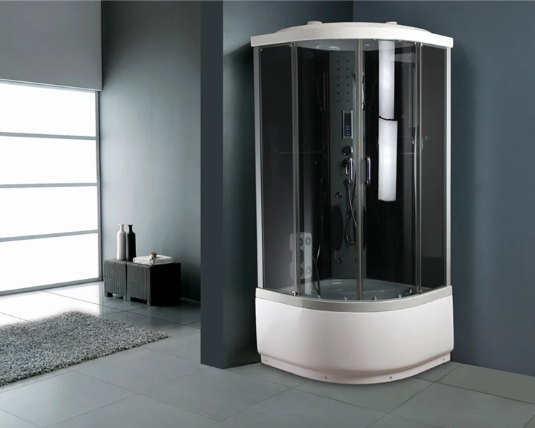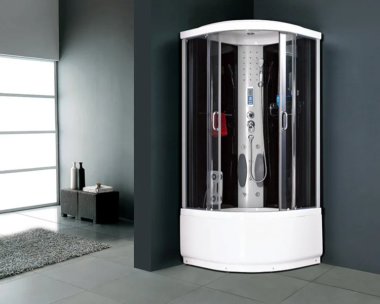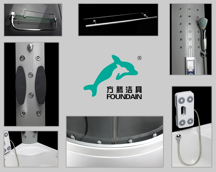 PMMA and ABS top and tray satin aluminum frame plastic back panel 5mm grey tempered glass Specification: 01.head shower 02.hand shower 03.handle 04.wheels 05.towel bar 06.faucet 07.8 back jets 08.foot massage 09.computer panel 10.exhaust fan 11.light