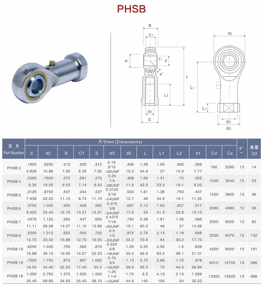 Remark: for left thread ball joint rod end bearing, please add suffix "L", e.g. "PHSL8"