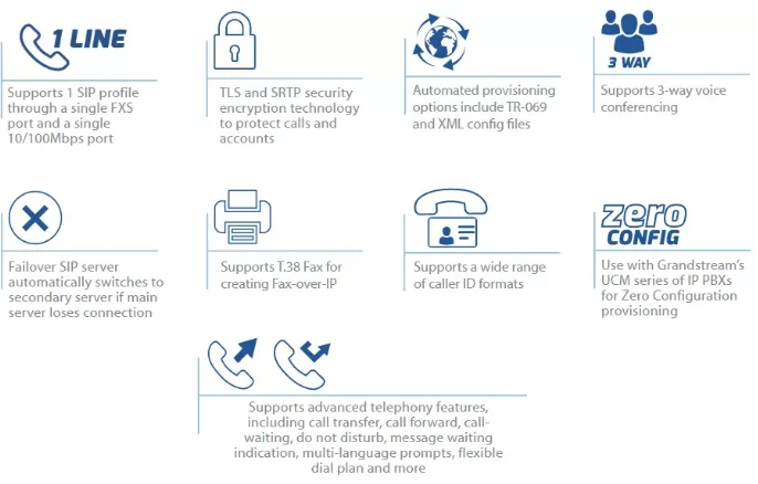 The HT801 delivers powerful VoIP technology and routing capabilities to home and office environments, and allows users to successfully connect their analog devices to a manageable and powerful VoIP network. Built upon Grandstream’s market-leading SIP ATA/gateway technology, with millions of units successfully deployed worldwide, this powerful ATA features exceptional voice quality in various applications and environments. The HT801 comes with 1 easy-to-use FXS ports, state-of-the-art encryption with a unique security certificate per unit, automated provisioning for volume deployment and device management and outstanding network performance.
