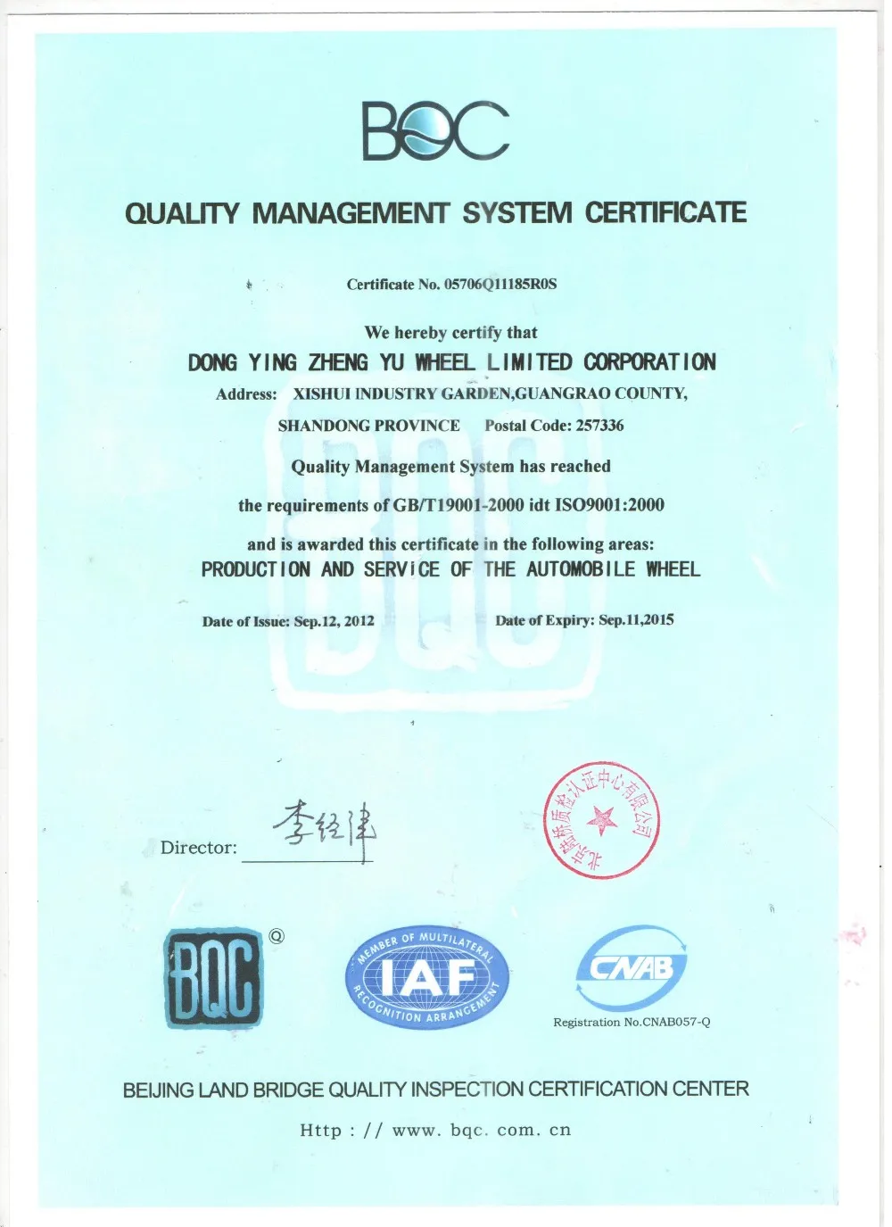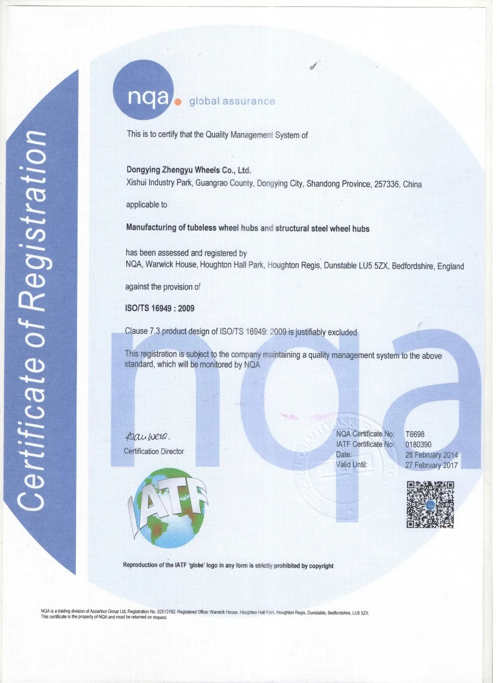 The company has been successfully passed ISO/TS16949:2009 quality management system certification of England NQA and has obtained the relevant certificate.