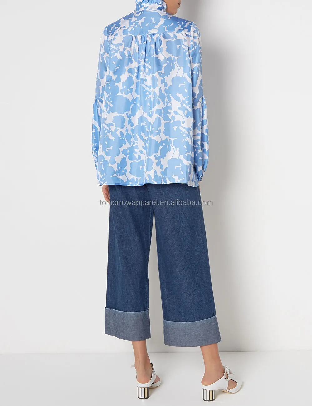 Blue & White Floral Printed Silk Satin Blouse Manufacture Wholesale Fashion Women Apparel (TA4044B)