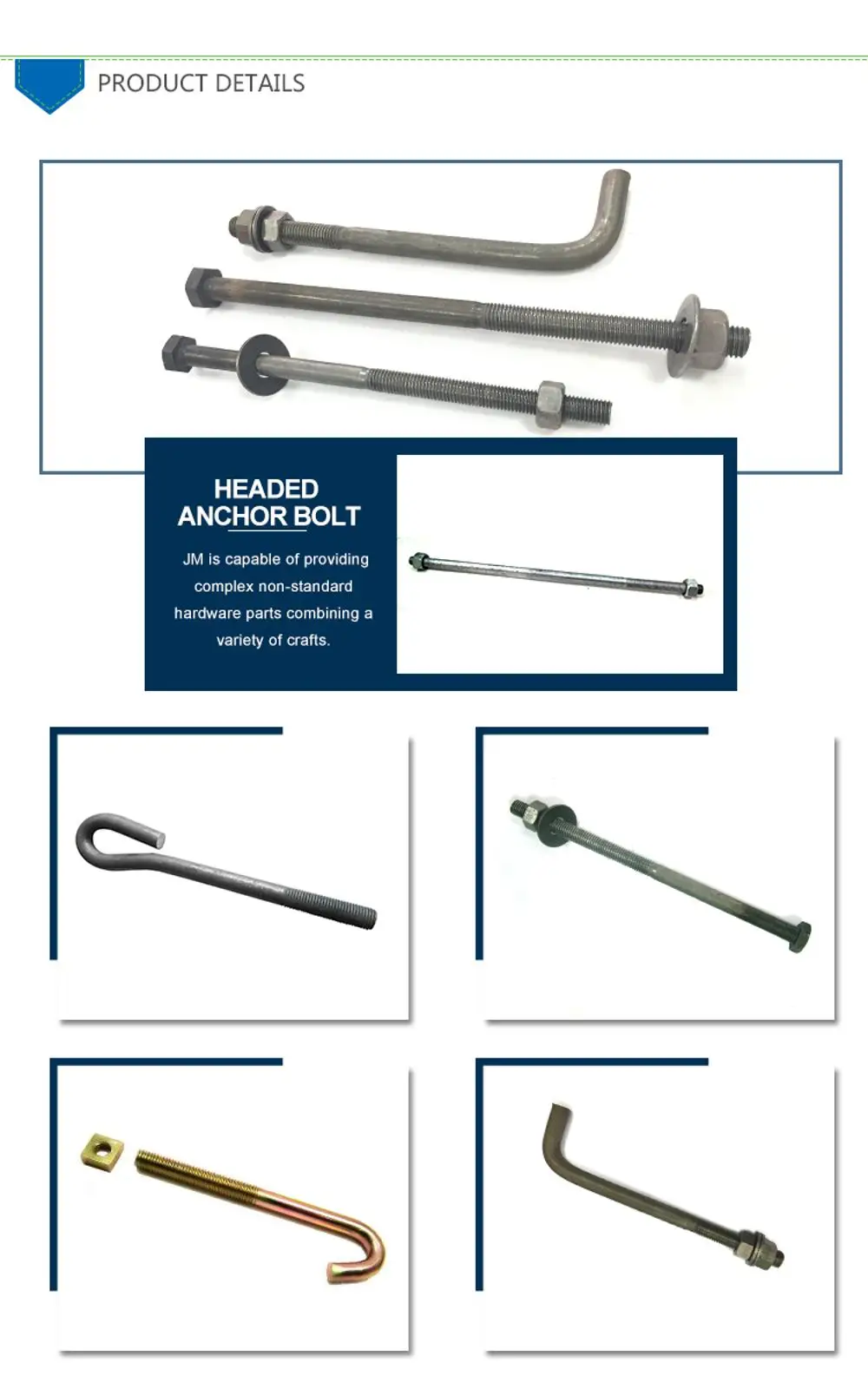 Head type: | forged hex, heavy hex or square head, eye hold, L head, double end |