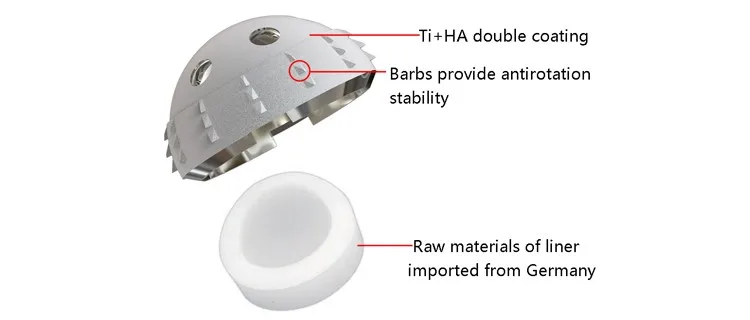 Acetabular cup 1. Long-term and effective fixation Ti+HA double coating; 2. The thickness of vacuum plasma-sprayed titanium porous coating and HA (hydroxyapatite) coating is 0.375mm, provides the optimal press-fit fixation effect; 3. The fishhook-shaped design on the cup make it easy to implant the prothesis and a better anti-rotational effect; 4.The liner is made from imported UHMWPE.