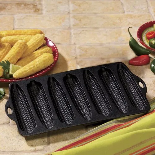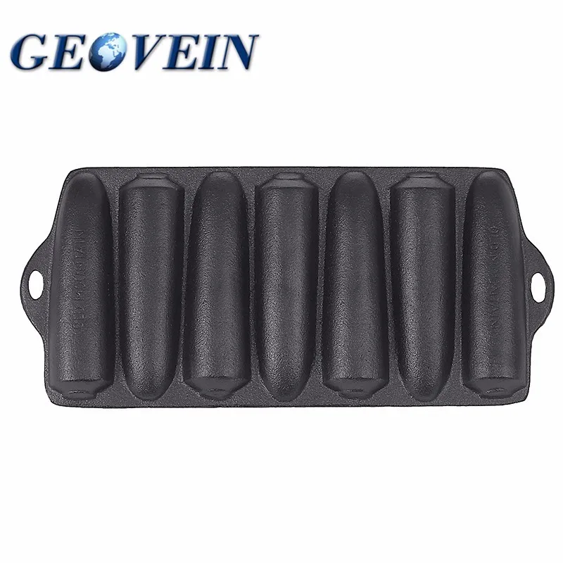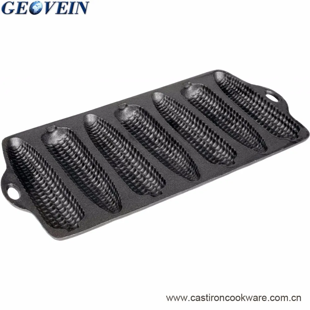 This cast iron cornstick bakeware is molded to make 5 inch long corn-on-the-cob shaped cornbread. Total cast iron muffin pan measurements are 12 inches long x 5.5 inches wide. This Geovein cake pan is pre-seasoned to perfection and ready for use. Cast iron cookware makes for superior heat retention and even heating of foods and cooking with cast iron provides nutritional iron intake. Though Nonstick when seasoned, hand wash Geovein Cookware cast iron cornstick cake pan with stiff brush and hot water. Heavy-Duty and durable, cast iron cookware is designed to last for years.