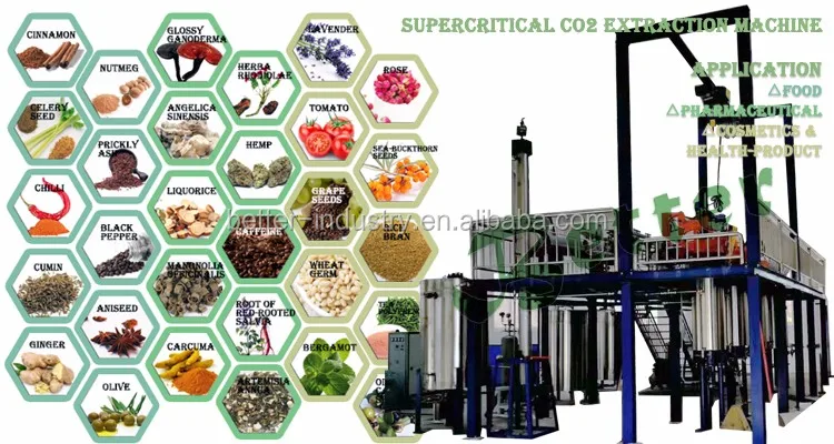 Liquid Co2 from pressured bottle or storage tank, through pipeline into purifying part, cooling part, mixer part, after heated and transferred into extractor, where solid raw material loading into barrel feeding into extractor, with dissolve ability to extracting, through temperature and pressure condition change, separated target material in separator. Separated material without chemical solution remained, Co2 would be gasifying after few seconds.
