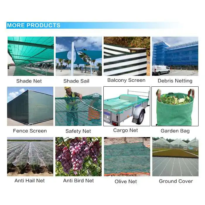 Our products include Sun Shade Net, Shade Sail, Safety Net,Safety Climbing Rope,Debris Net, Scaffolding Net, Anti-Hail Net, Anti-Bird Net, Anti-Weed Net, Olive Net, Garden Bag, POP-UP Bag,Cargo Net, Sports Net etc. Which is widely applied in Agricultural,Construction,Gardening,Tourism,Sports etc.,and Customized Net can be made as per requirement.