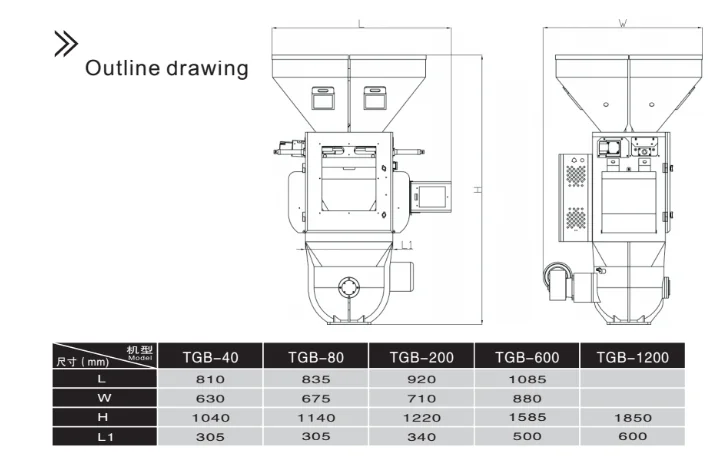 TGB series gravimetric blenders adopt the latest single-chip microprocessor with a digital display for easy calibration. It has more powerful function, higher speed, and stronger antijamming capability. It has auto compensation ability, which will automatically calibrate in order to ensure the accuracy when the machine starts. It's mostly applied in plastic injection, extrusion or material mixing which requires a variety of raw materials to be accurately mixed according to the weight ratio.