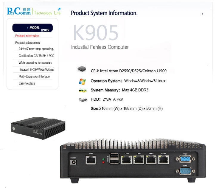 Main Board | •Intel® Atom™ D2550 Dual Core processor, 1.86GHz •Integrated Intel GMA 3600 | •Intel® Atom™ D525 Dual Core processor, 1.8GHz •Integrated Intel GMA 3150 | •Intel®J1900 Four Core processor, 2.0GHz | ||