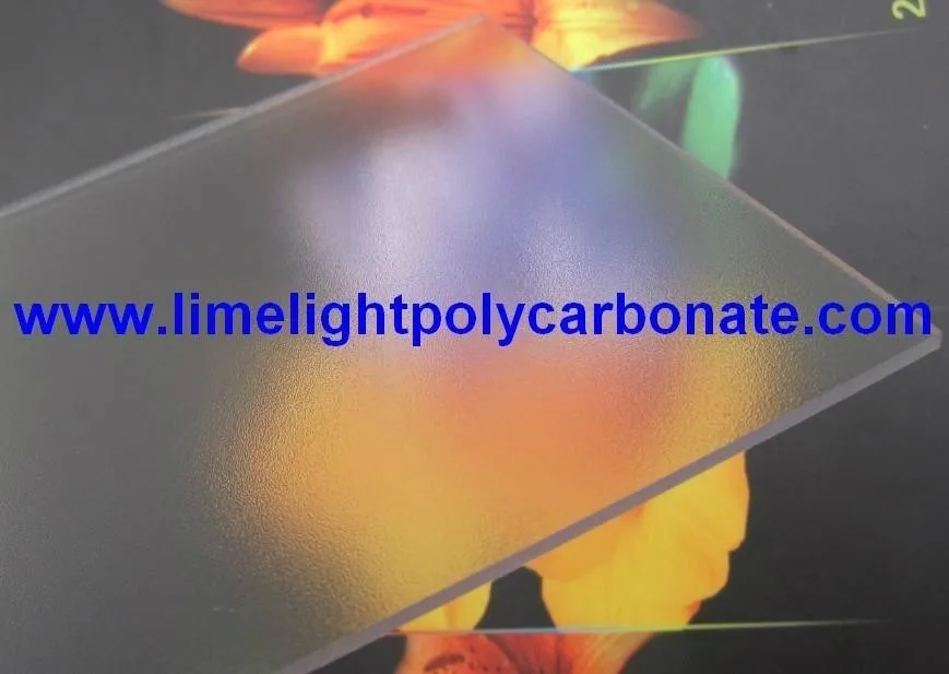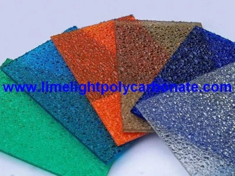 Polycarbonate embossed sheet is made of is made of high quality virgin material from Bayer, Germany and GE, USA, with one side(Or two sides) UV layer, 10 years warranty.