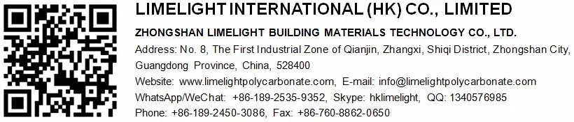 Zhongshan Limelight Building Materials Technology Co., Ltd. is affiliated with Limelight International (HK) Co., Limited(Reg. No.:1366659), which a reliable and trustworthy building materials supplier with the object of researching, manufacturing and distributing polycarbonate awnings, polycarbonate carports, polycarbonate kayaks, multiwall polycarbonate sheets, solid polycarbonate sheets, embossed polycarbonate sheets, corrugated polycarbonate sheets, polycarbonate skylights, Synthetic roofing tiles, ASA/PVC roofing sheets, APVC roofing sheets, UPVC roofing sheets, twinwall PVC roofing sheets, FRP daylighting sheet and related accessories since 2009.