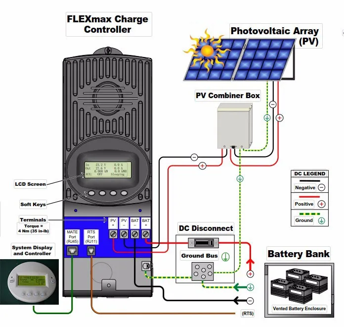 Included in all of the FLEXmax Charge Controllers are the revolutionary features first developed by fangpusun , including support for a wide range of nominal battery voltages and the ability to step-down a higher voltage solar array to recharge a lower voltage battery bank . A built-in,backlit 80 character display shows the current status and logged system performance data for the last 128 days at the touch of a button . The integrated OutBack network communications allows FLEXmax series Charge Controllers to be remotely programmed and monitored via a MATE system display and provides unrivaled completes integration .