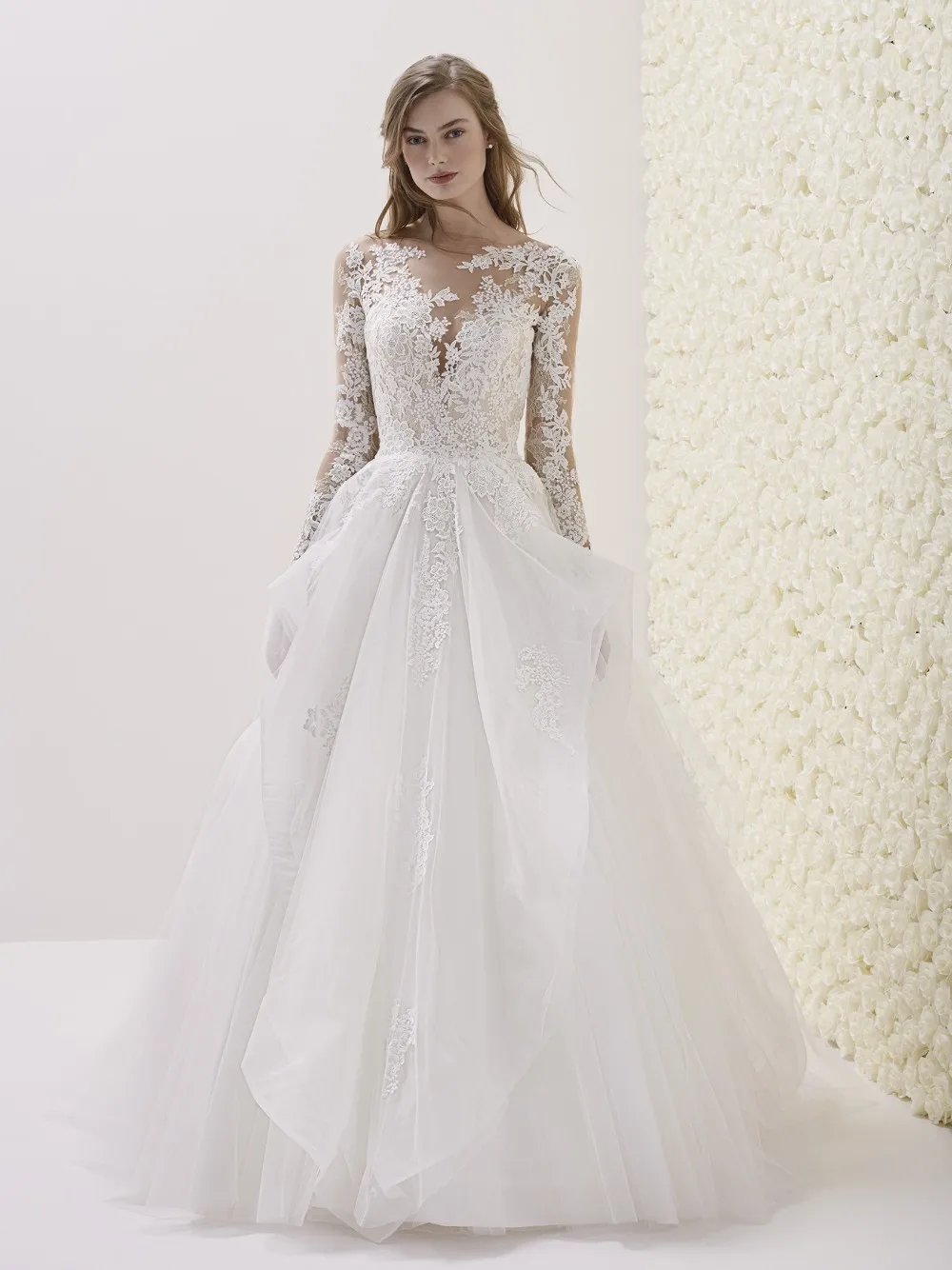 Super Puffy Wedding Dress White Lace Long Sleeve Wedding Dress