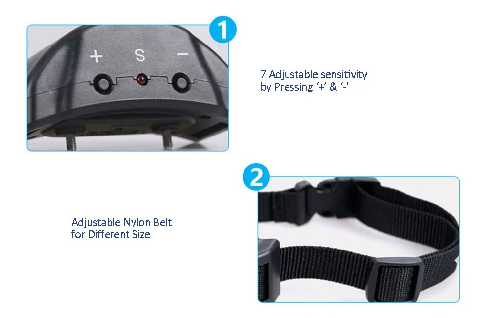 There are two BUTTONS used to adjust the sensitivity to the bark,and every time there will be “B”out of tone,sensitivity will gradually be enhanced or weakened.The more sensitive,the easier to trigger the collar.