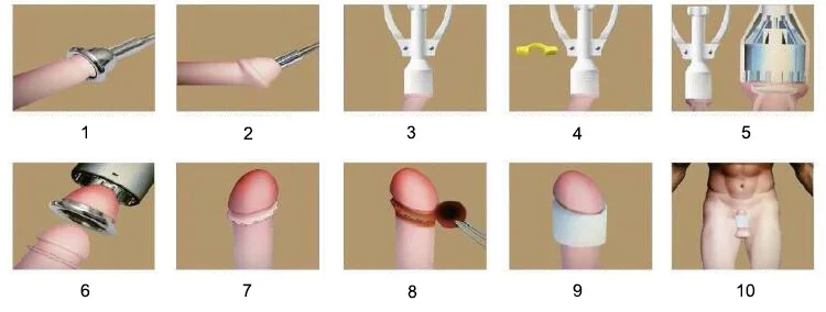 1. Select the appropriate type of Circumcision&Suturing Device 2. Place the concave seat on the glans and adjust the angle to avoid damaging the strap 3. Fix the foreskin cutting position into the center hole adjustment knob 4. Unplug the insurance pin for cutting &sewing operation 5. Segmentation process during cutting 6. Reverse adjustment nut exits the female seat 7. Neatly cut, suture evenly 8. Disinfect the wound for dressing 9. Check the wound, if no problem to do bandage protection 10. The dressing is complete, the glans up, wear on tight panties