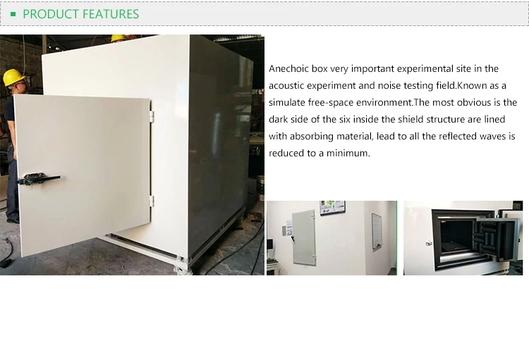 | Optional accessories | Air conditioning, circuit monitoring, automatic door, visual observation window, enter / exhaust system, test stand. metal acoustic wedge , colth acoustic wedge . |
