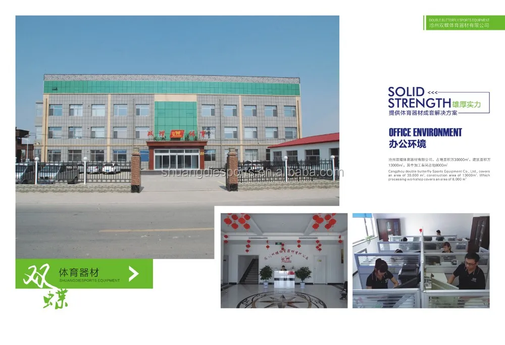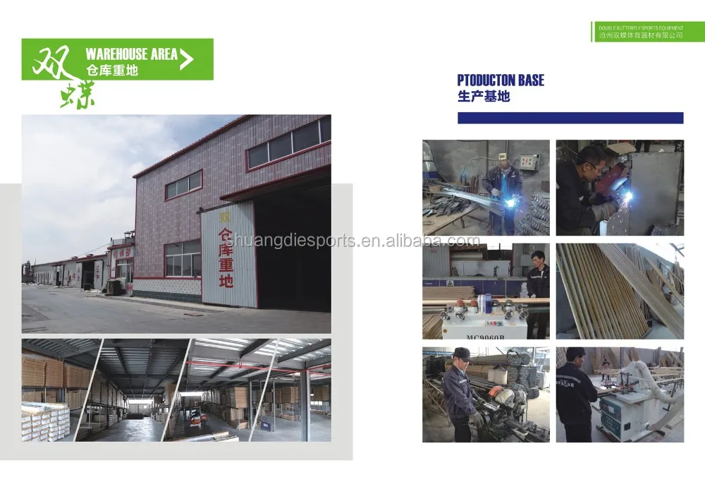 Founded in 1983, Cangzhou Shuangdie Sports equipment Co., Ltd. is a large professional manufacturer innovated in research and development, design, manufacturing, sales and service. The predecessor was Haixing Shuangdie Table Tennis Factory, and for almost 40 years, we have been specialized in the products related with sports. The main product range covers all kinds of indoor and outdoor table tennis tables, all kinds of dancing barre, wooden ribs, footsteps, basketball stands, fitness equipments, all kinds of mats, badminton, tennis and volleyball outfit series and the construction projects of fitness floor.