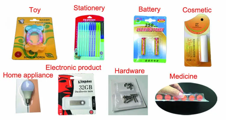 Applies to plastic blister(made by PVC, PET, PETG etc.)seal with paper card. It's suitable for the packaging process such as toys, stationery, foods, commodity, cosmetics, hardware, medicine, etc.