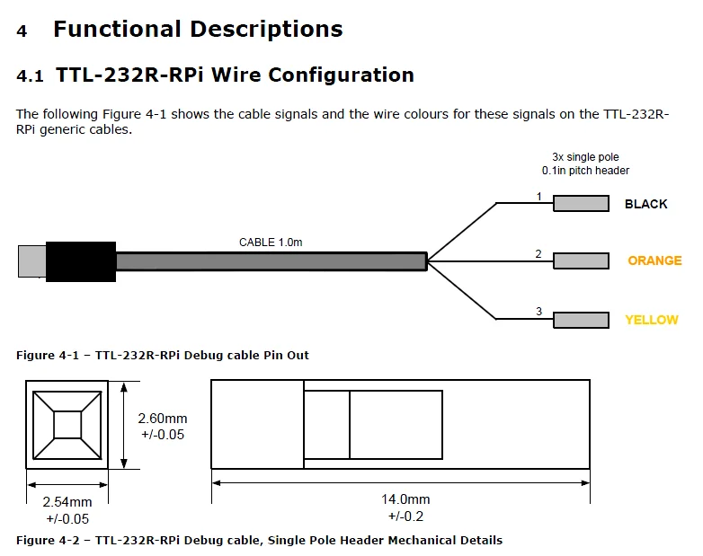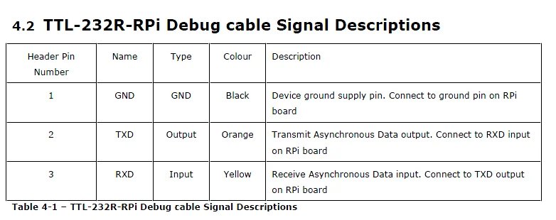 TTL-232R-RPi is a USB to TTL level serial UART converter cables incorporating FT232RQ USB to Serial UART interface IC device which handles all the USB signalling and protocols. The TTL-232R-RPi is designed for use with the Raspberry Pi (RPi), an ultra low cost, Linux based miniaturised computer. The debug cable sits on the Rx/Tx of the RPi ARM processor UART which provides much more detail of what's happening within the RPi operating system. Connecting the debug cable to a PC and communicating with the RPi via a terminal emulator on a PC gives the user access to more detailed information from the Linux kernel during RPi start up, which appears on the Rx/TX lines of the UART, as well as being able to login and access the kernel itself from the PC.