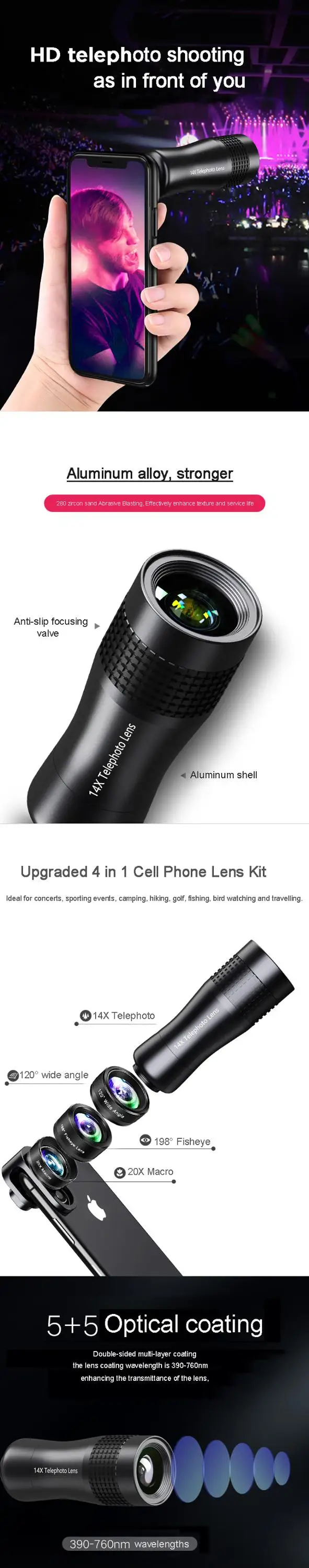 14X Aluminum telescopic selfie telephoto lens fisheye wide macro lens 4 in 1 phone camera lens kit for iPhone