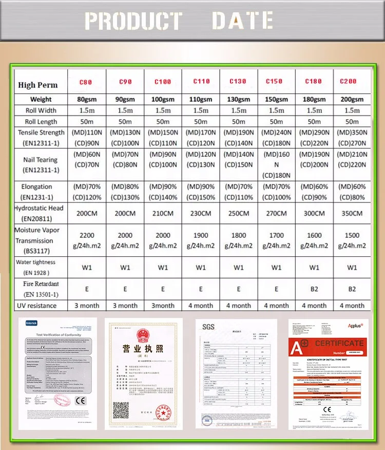 1) Breathable membrane with excellent waterproofing properties.