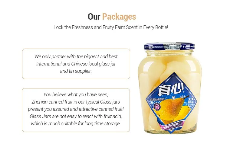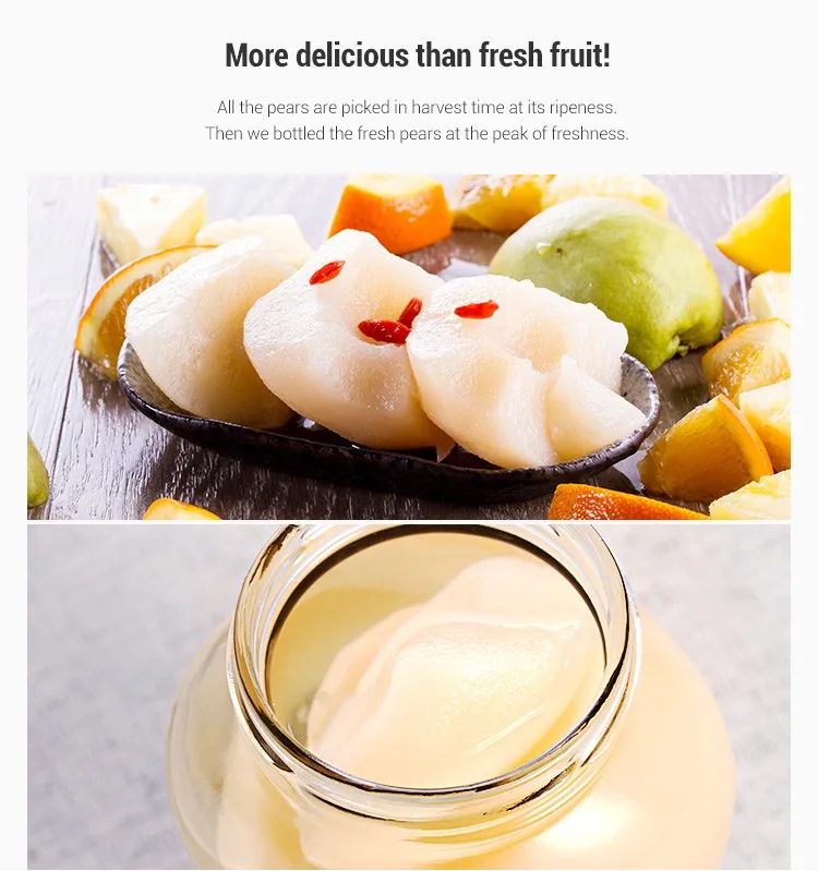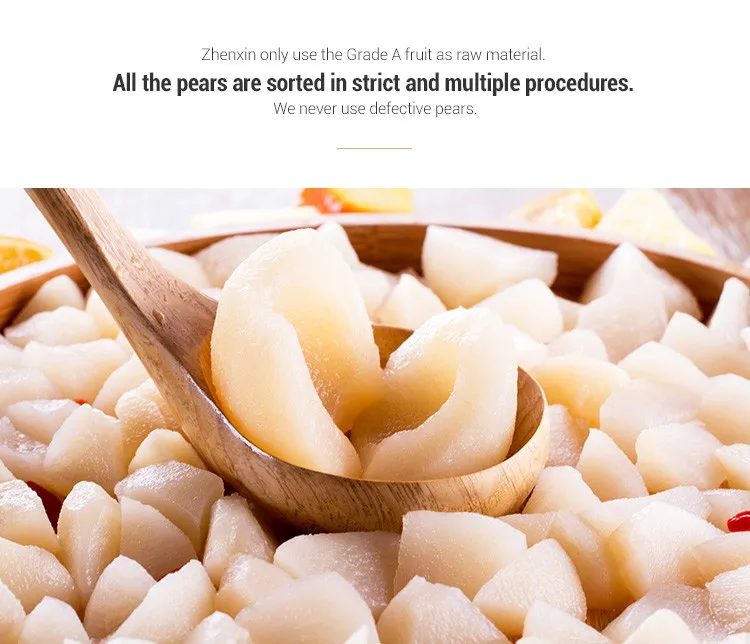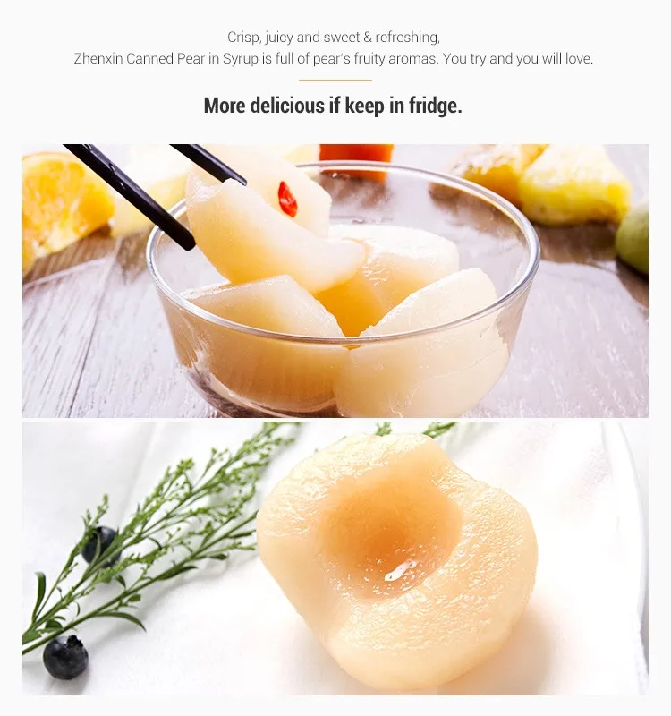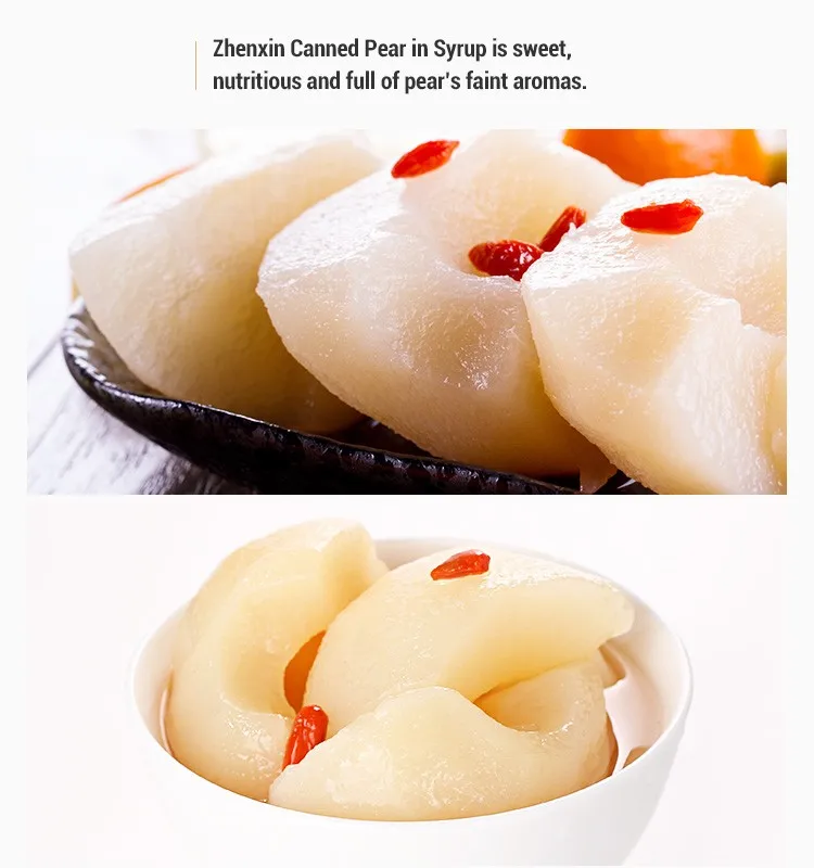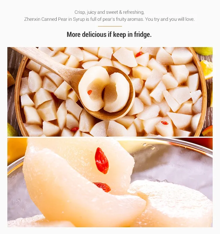 Crisp, juicy and sweet & refreshing, Zhenxin Canned Pear in Syrup is full of pear’s fruity aromas.