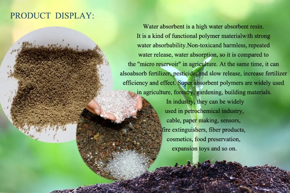 ◊ Soil improvement.WRA is a kind of organic compound. It turns to be gelatinous after absorbing water, which is very easy to make the soil granule and make the soil more loosen.