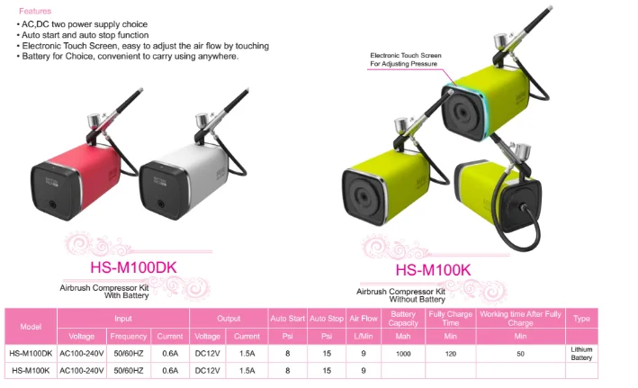 Xirui mini air compressor kits are suitable for essence,.makeup.cosmetic.etc. There are plenty of accessories available.From most simple cheap compressor to luxurious complete kit for your choice.