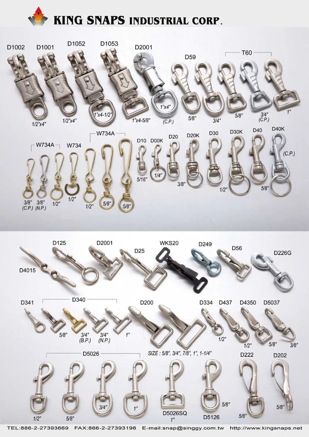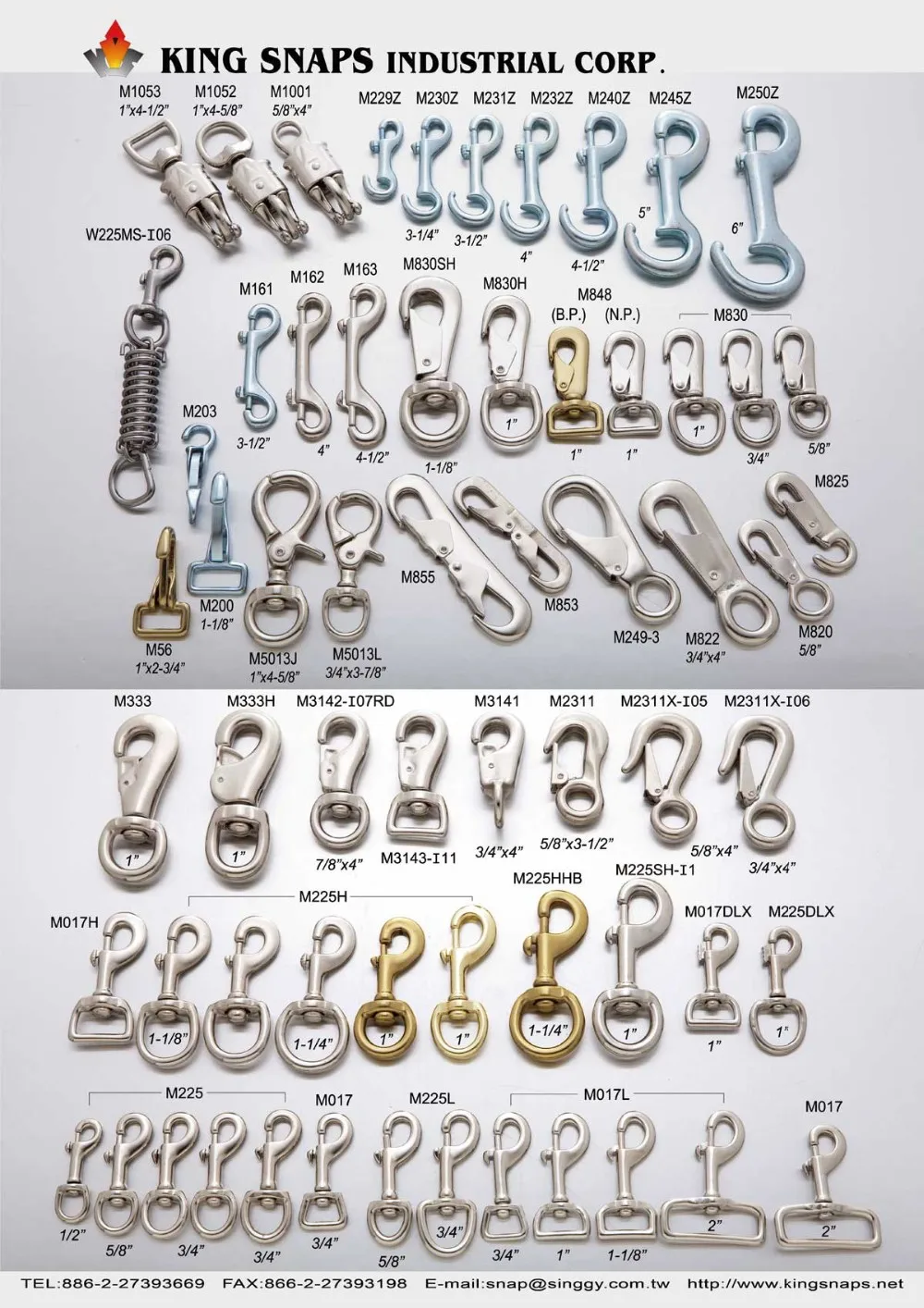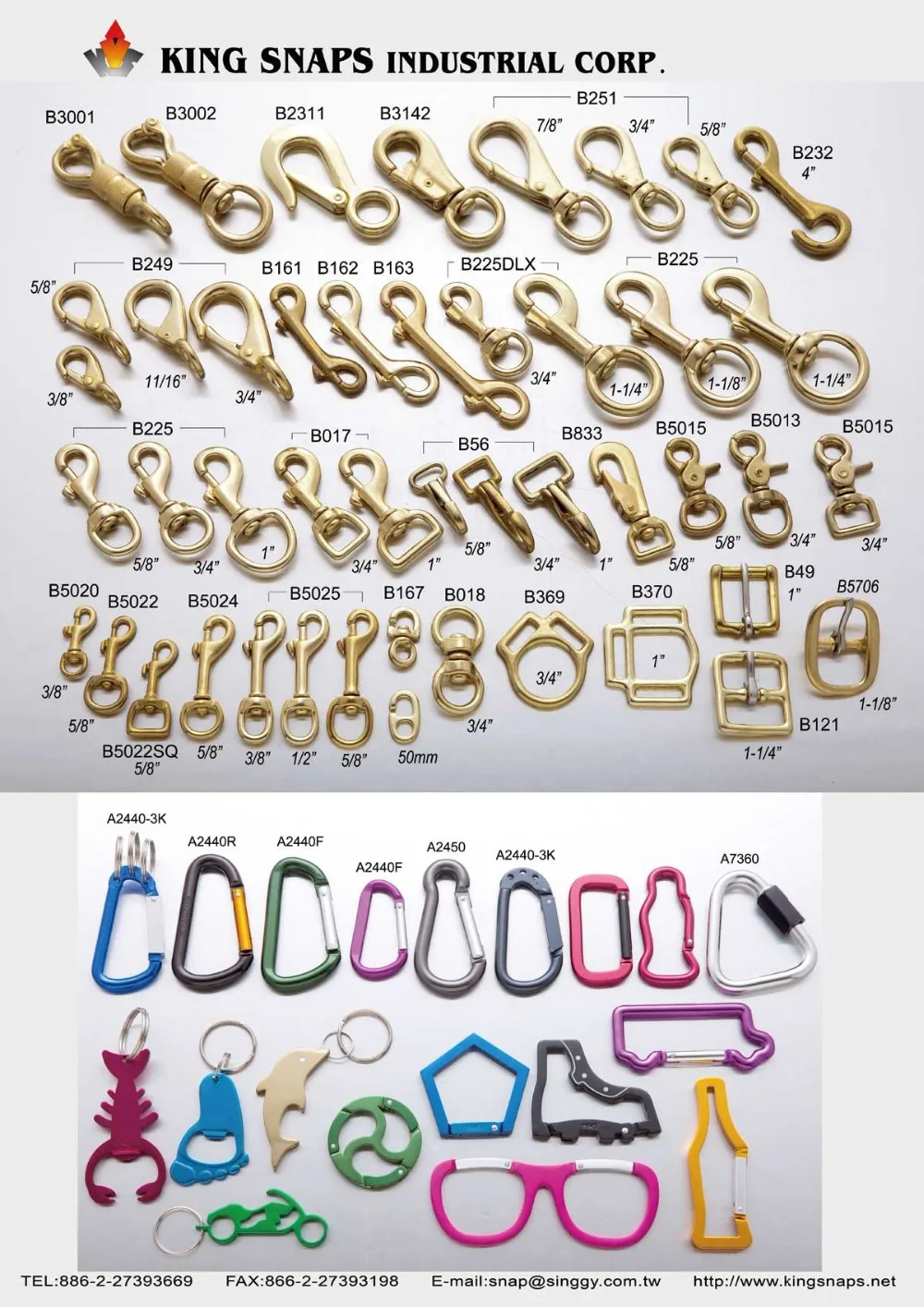 King Snaps Industrial Corp. are specialized in supplying, developing and producing Safety Equipment, Safety Hardware, Climbing Gear, Sports & mountain climbing gear and accessories, Carabiners, Rock Climbing Carabiners, Safety Hooks, HMS, Pulleys, Quick Release Buckles, Harness, Marine Hardware, Quick links, Shackles, Bolts, Turnbuckles, snaps, Snap Hooks, Spring Hooks, Swivels, Rigging Hardware, Thimbles, Wire Rope Clamp(Clip), Saddle Hardware, Brass Hardware used for safety in climbing, rescue, yachting and industrial works.