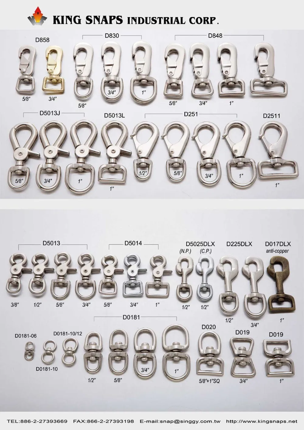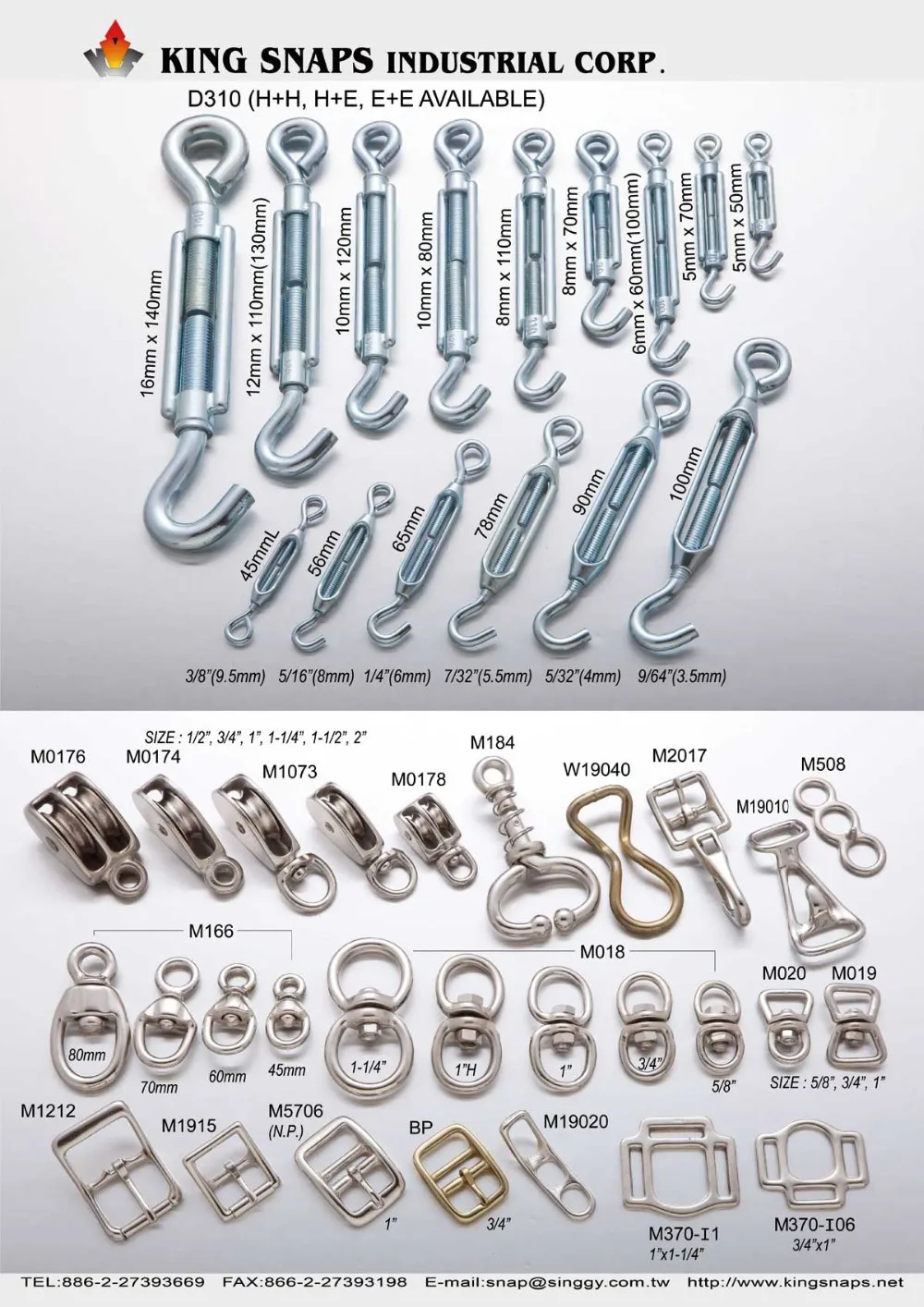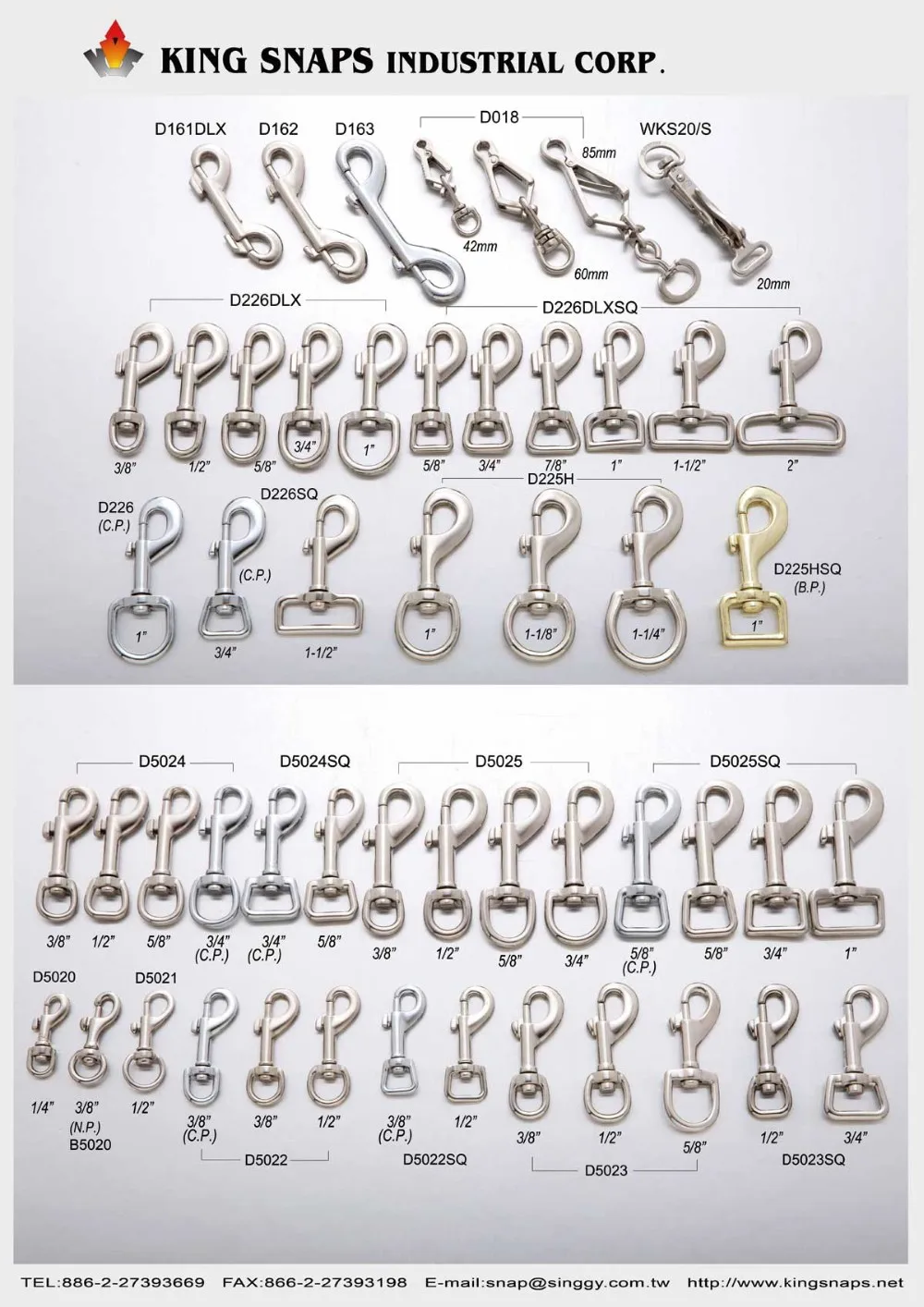 King Snaps Industrial Corp. are specialized in supplying, developing and producing Safety Equipment, Safety Hardware, Climbing Gear, Sports & mountain climbing gear and accessories, Carabiners, Rock Climbing Carabiners, Safety Hooks, HMS, Pulleys, Quick Release Buckles, Harness, Marine Hardware, Quick links, Shackles, Bolts, Turnbuckles, snaps, Snap Hooks, Spring Hooks, Swivels, Rigging Hardware, Thimbles, Wire Rope Clamp(Clip), Saddle Hardware, Brass Hardware used for safety in climbing, rescue, yachting and industrial works.