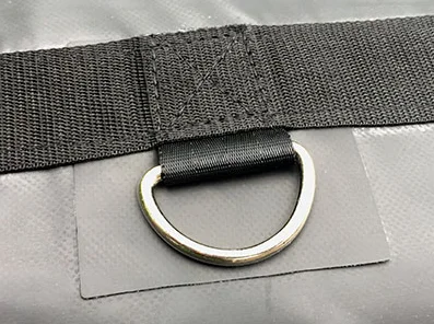 3.D-Rings: 3 rows of stainless steel D-rings, box-stitched with protective flap. D-rings are spaced every 24" with a row at 31", 61", and 91".