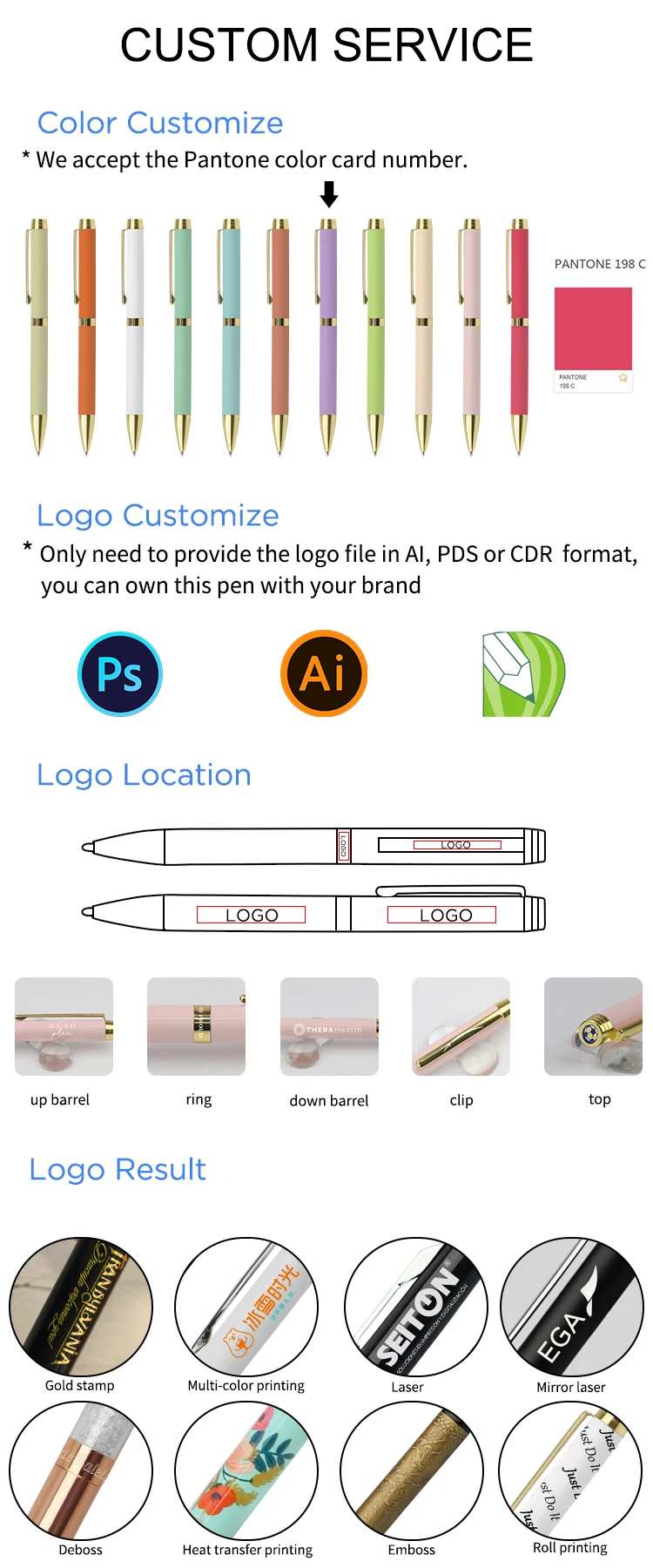 A:Our products include metal pen,ballpont pen,roller ball pen,crystal pen,laster pen,USB pen,screen touch stylus pen,wood/bamboo pen,leather pen,pen set,desk pen and more.