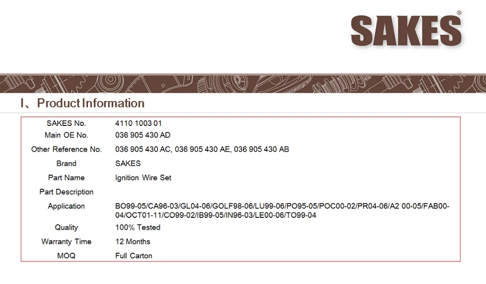 High quality auto parts Ignition Wire Set 036 905 430 AD for BO/CA/GL/GOLF/OCT/TO