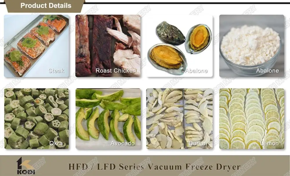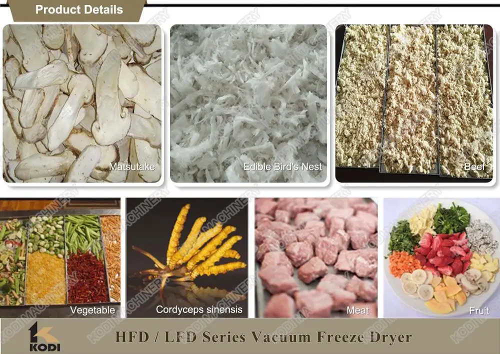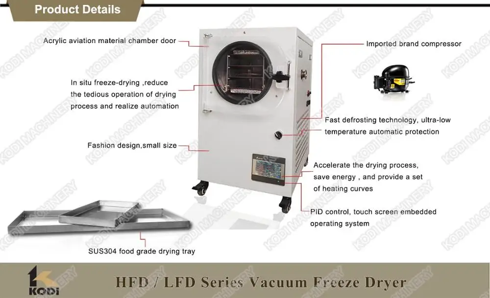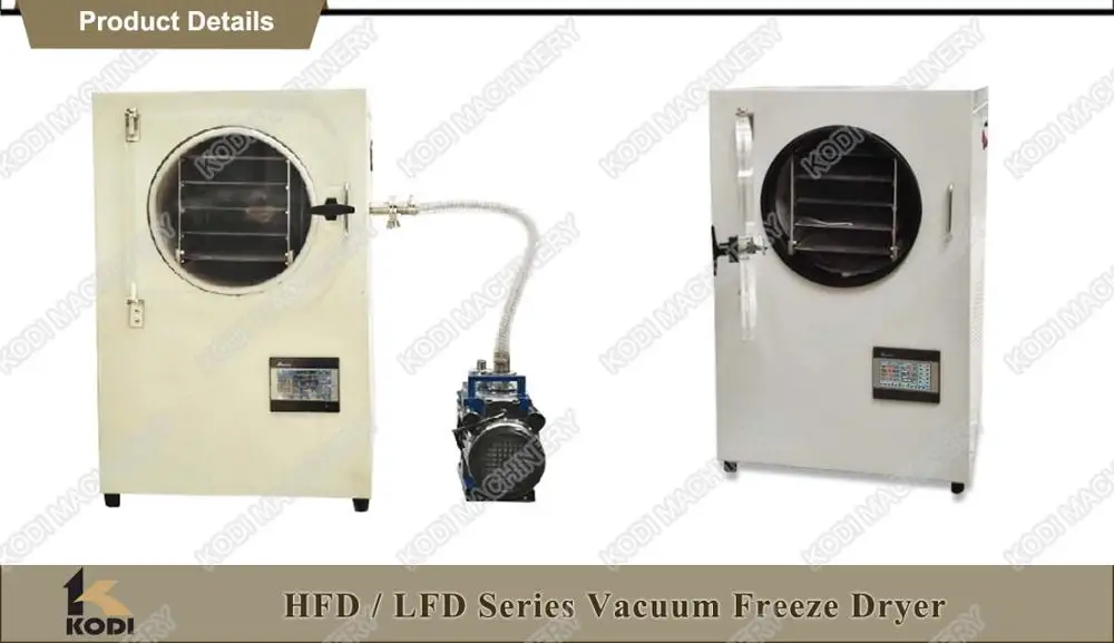 The major parts of KODI small vacuum freeze dryer price are imported from other countries, characterized by stability and reliability and many other advantages, such as good-looking appearance, small volume, light weight and easy operation. They can be widely applied to many fields, such as foods, biological products, chemical engineering, traditional Chinese medicinal materials and health care products. Because the drying process is carried out at low temperature, it can be used for some materials such as proteins, which are easy to be denatured at high temperature, and can ensure that the properties of other compounds will not change.