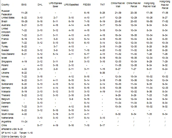 Noted: The above just for your ref, for actual delivery days (UPS,DHL,FEDEX,TNT,EMS), please contact your local service center or view their official website for details.