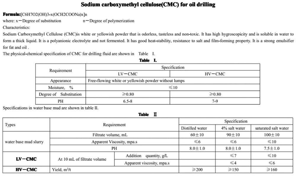 With CMC, the oil drilling fluid can make the wall of well form a thin and solid filter cake, with low permeability, so as to reduce the rate of water loss.After adding CMC, the oil drilling fluid can make sure the drilling machine have low initial gel strength, help mud to easily release the gas covered and discharge the debris into the mud pit.
