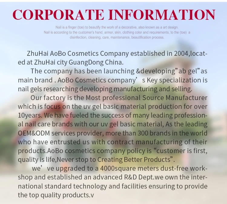 | 5.MOQ for each color | No MOQ if using our ABGel bottle |