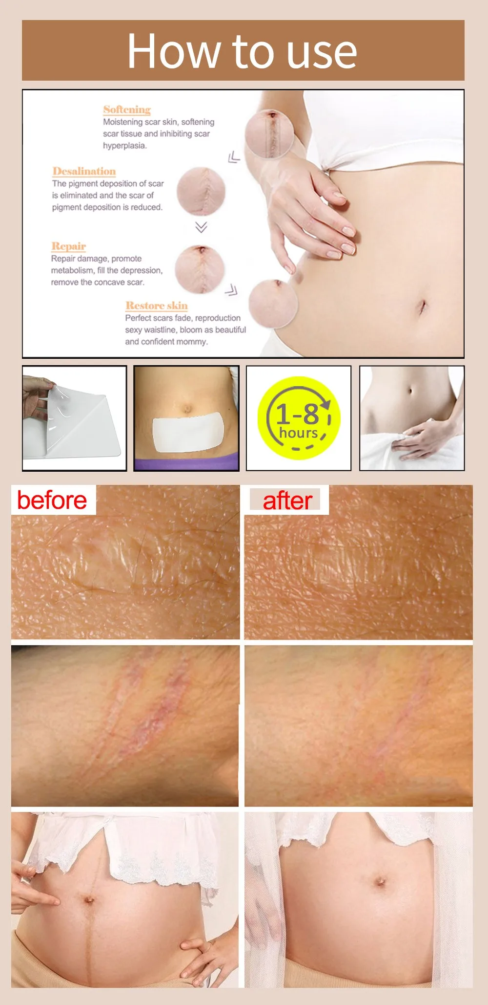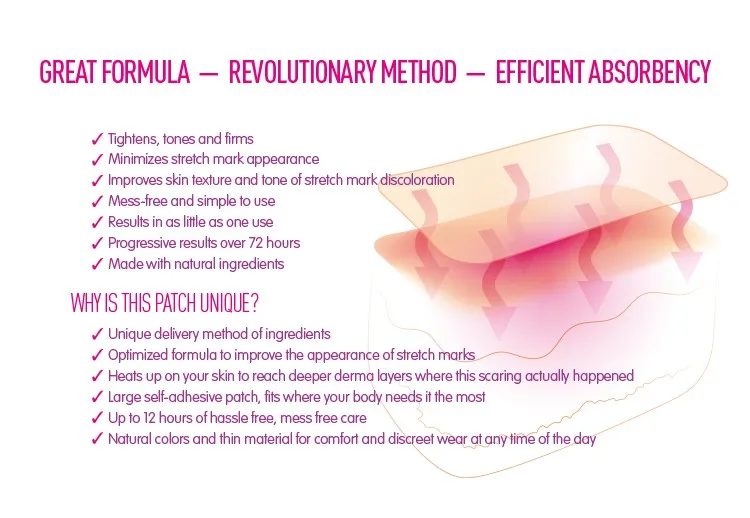 The Stretch marks patch delivers a breakthrough in scar and stretch mark management by leveraging the convenience and persistent delivery of a patch, for up to 10 hours. it is combined with heat stimulation to increase circulation that opens pores and to deliver an optimized formula of proven ingredients to a deeper layer of the skin where the stretch mark patch can be truly effective.