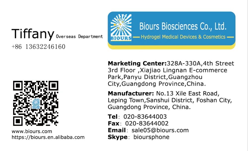 1. Biours Biosciences Co.,Ltd is located in Foshan city, Guandong province in the south of China, specialized in reseraching and developing hydrogel healthcare products and hydrogel beauty products for 9 years experience.