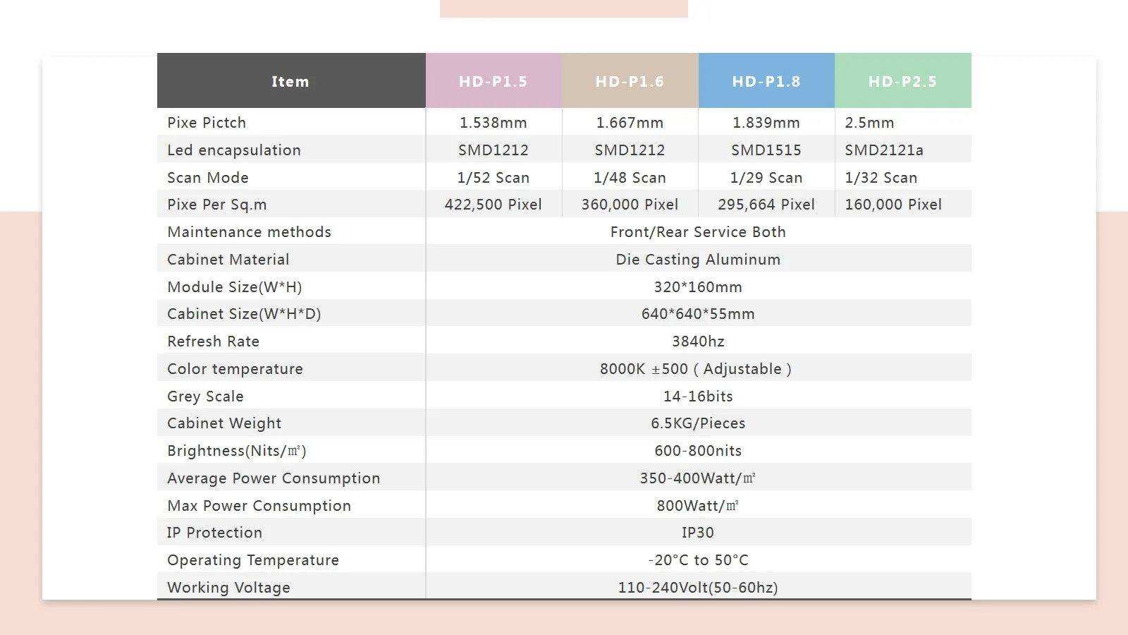 Viewing angle is up to 160° vertical and horizontal, providing a wide viewing angle. Both 160° from horizontal & vertical for the viewing angle. Seeing from five directions, it would be still the natural and clear image in an LED display.