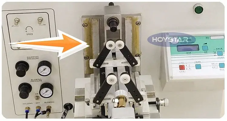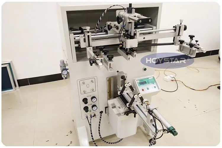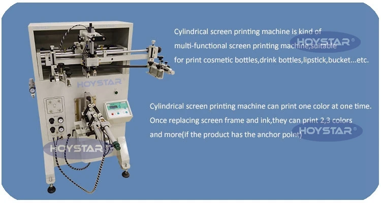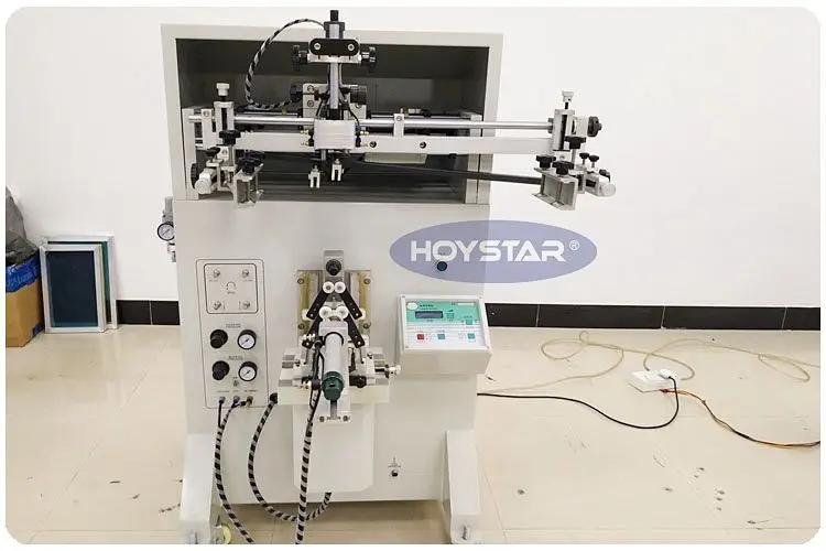 this screen printing machine is a medium size curved screen printer,It print fastly with steady quality and lower voice. It is suitable for printing cosmetics, containers, food packages and other curved products surface
