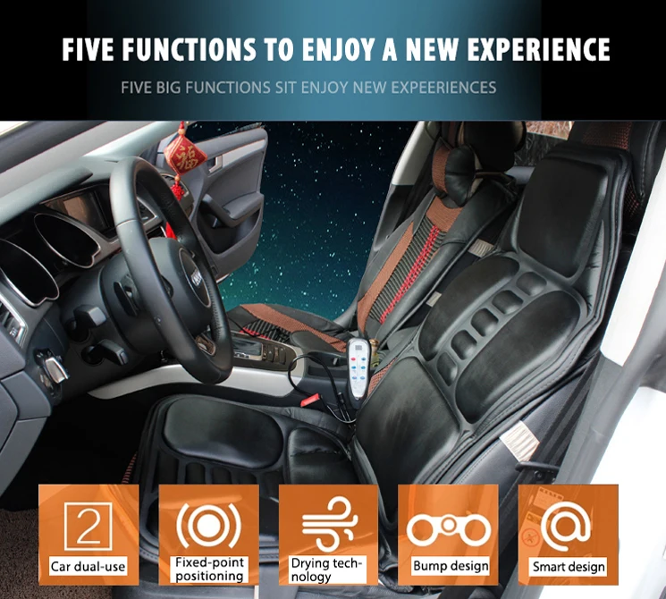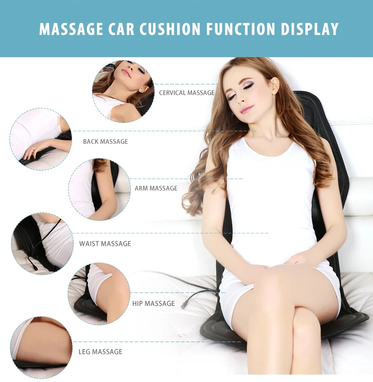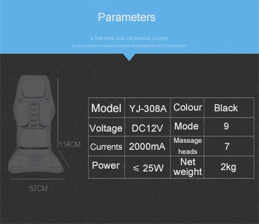 This product is a multi-purpose massage cushion for automobile. The outside part is made of textile material, with 7 sets of motors inside. The product is equipped with a luxury hand controller and a timeset. It can be supplied by automobile power or household power.