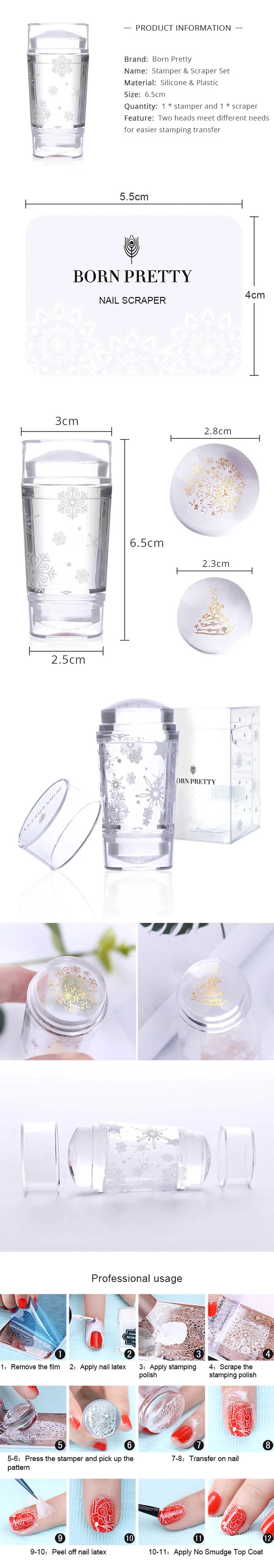 Usage | The Stamper is used for nail art stamping, first you should have a nail art stamping plate. 1. Rip off the film on the stamping plate 2. Put a drop of polish on the pattern you want, then use the scraper spread the nail polish evenly 3. Press the stamper on the pattern, and then print it on your nails |
