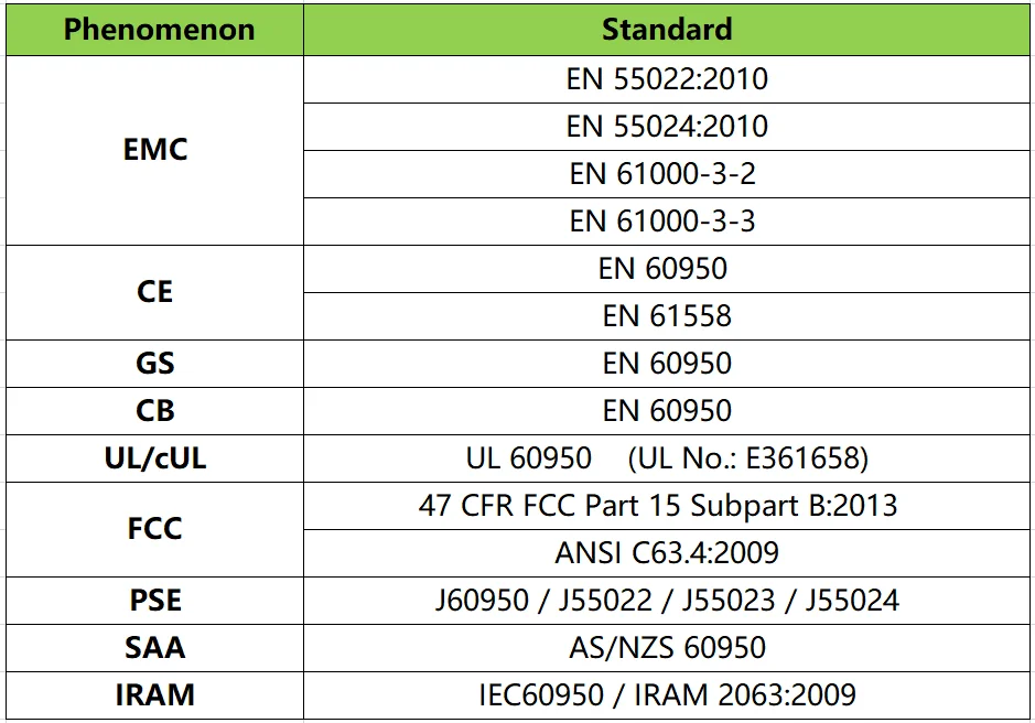 ISO9001:2008 system is fully implemented in our management. Our products have passed most of safety approvals in the world, including UL, cUL, FCC, PSE, GS, CE, SAA, CCC, C-tick, CB, etc.
