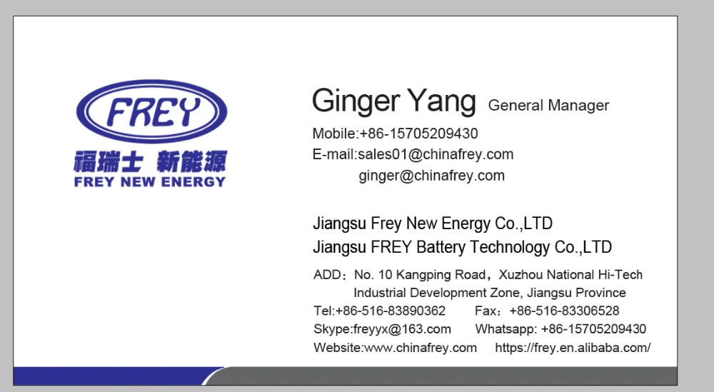 Jiangsu Frey Battery Technology Co.,Ltd established in July,2010 in Xuzhou,one of China's important modern industrial cities and becomes a high-tech enterprise specialzing in research and development ,production and marketing of lithium-ion battery, battery packs and battery management systems. Annual battery production capacity 30 million Ah.